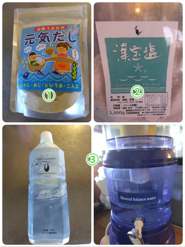 ③左の写真のミネラル原液を添加したお水を料理、飲料に使います。家族全員使っても1ヶ月7000円ほどです。